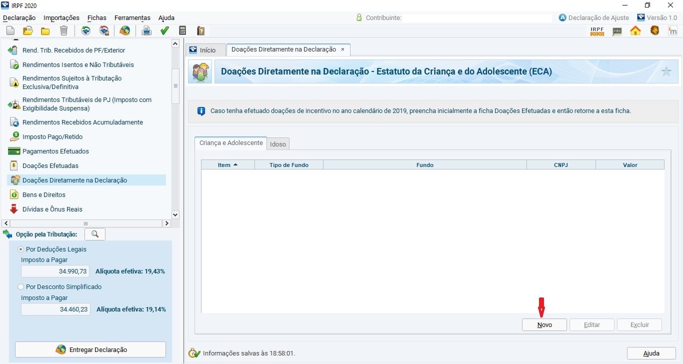 Passo 1 – Após preencher e conferir sua declaração no programa da Receita Federal e antes de remete-la, cliquar na aba “Doações Diretamente na Declaração” e clicar em “Novo”