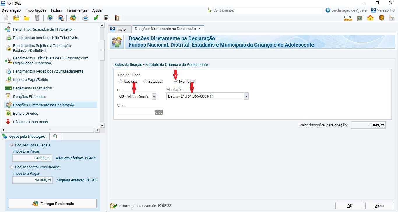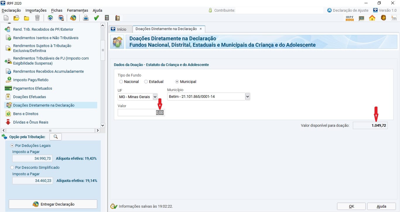 Passo 3 – Verificar o “Valor Disponível para Destinação” e copiar o número para o campo “Valor” (valor da doação);