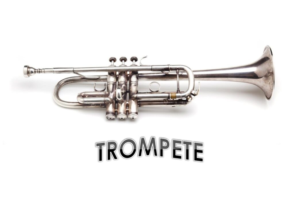 O trompete é um instrumento de sopro de metal. Ele tem tubo cilíndrico. Boca pequena dá som brilhante e alto.